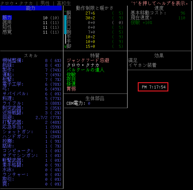 現在の能力値は上の画像。製作スキルと電子工作スキルがレベルアップ寸前だ。この2つのスキルはクラフトに関係するから優先的に鍛えたい。