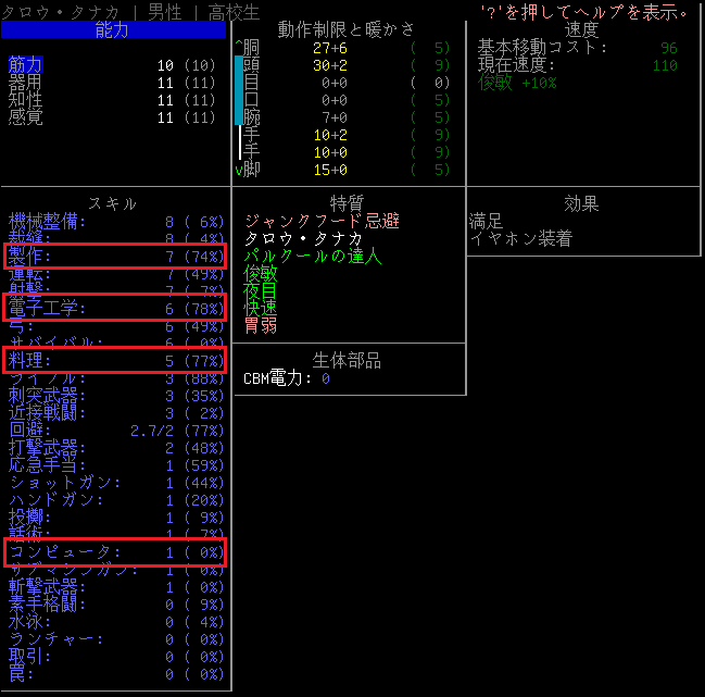 現在の能力値は上の画像。コンピュータースキルを上げればクラフト可能なアイテムが増えるかもしれない。近日中にコンピュータースキルを鍛えます。