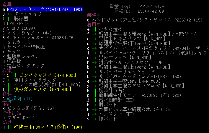 書いている人が疲れたのでプレイ日記を中断します。現在の所持品と装備品は上の画像。シグ・ザウエルの威力は弓矢よりも弱かった。