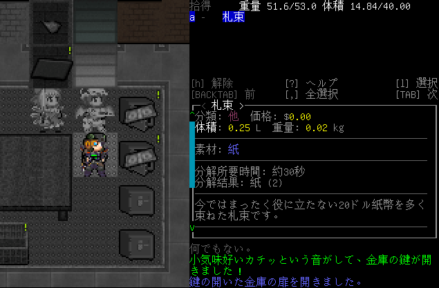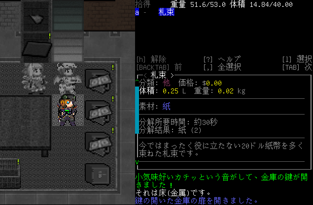 1個目の金庫の中に入っていたのは『札束』だ。札束の価格が『$0.00』なのは可哀想だし納得がいかない。崩壊後の世界なら紙は貴重品だと思うけどなあ。