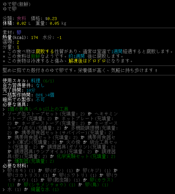 ゆで卵を調理して仲間にあげました。今回のプレイ日記はここで終わりにします。次回もバイクに乗って町の東側にある施設を漁ります。
