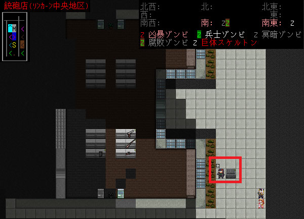 危なくなったら逃げれば良いので町の中心部に行きましょう。書店の近くにある銃砲店に到着しました。アセチレン灯が無いから侵入できねえぞ!しかも巨体スケルトンが出現しやがった。