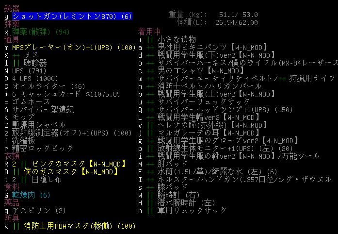 現在の所持品と装備品は上の画像。レミントン870は常に持ち歩くことにします。現在のタロウ・タナカはライフル、ショットガン、ハンドガンで武装していることになる。