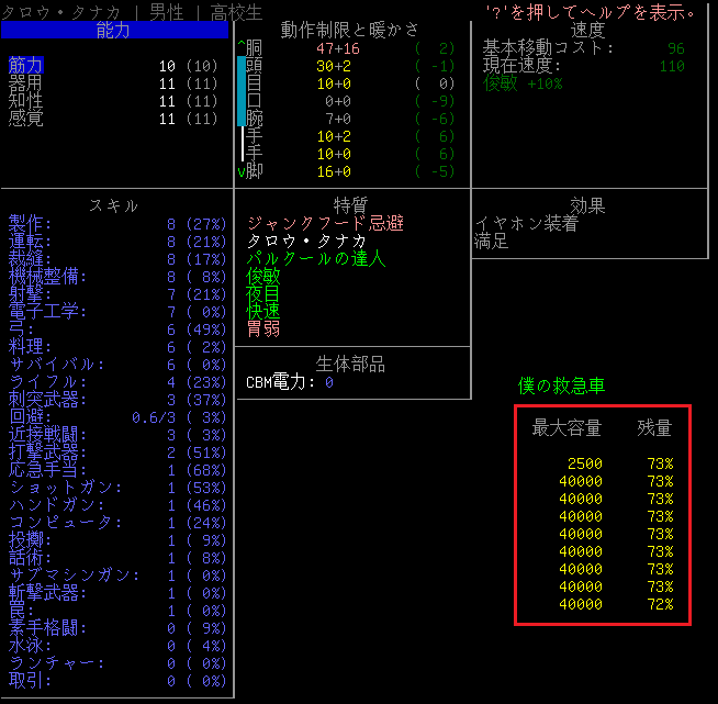 現在の能力値は上の画像。とくにコメントはありません。救急車のバッテリー残量は約70%だった。ここ数日は救急車のエンジンを稼働させていないからな。