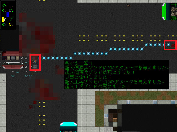 仲間を倒された超人工兵ゾンビが敵対状態になっています。本気になった超人工兵ゾンビは強いので挑発しない方が良かったかもしれん。この道路で発狂されるとアパッチの部品を回収する際に邪魔になるから倒しておきたかった。