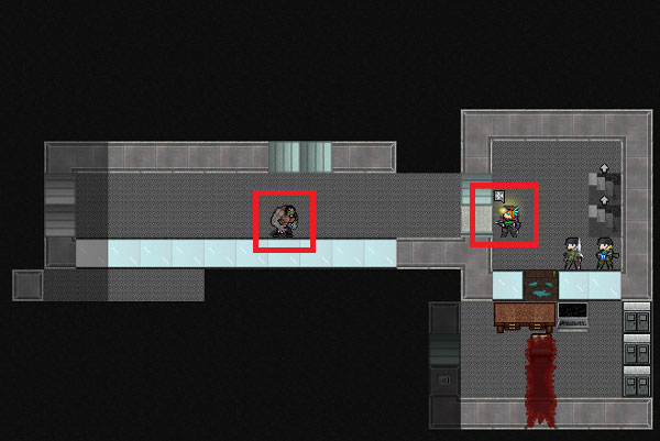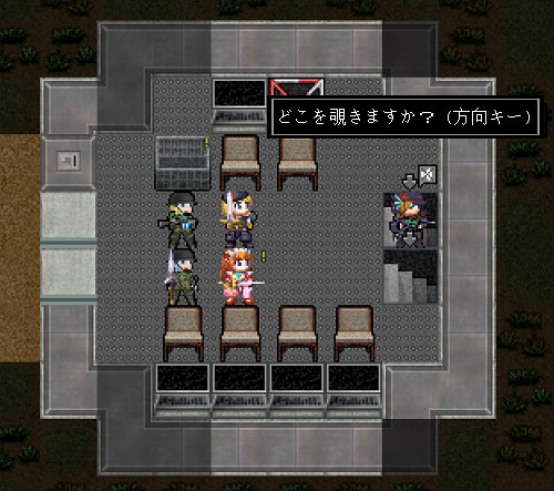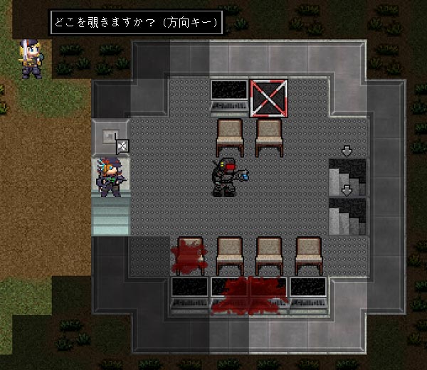『X』コマンドで中を覗いた時の俺は上の画像。建物の中には超人工兵ゾンビが徘徊していました(無視状態)。地下室に降りる階段もあります。アポフィスは地下室に潜んでいるのか!