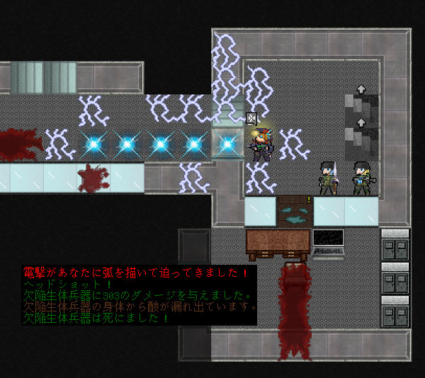 幸いにもまだ電撃はくらっていません。少し離れた場所に2体目の欠陥生体兵器がいるようだね。この場所からレーザースナイパーで狙撃しよう。むやみに敵に近づくのはやめた方がよろしい。