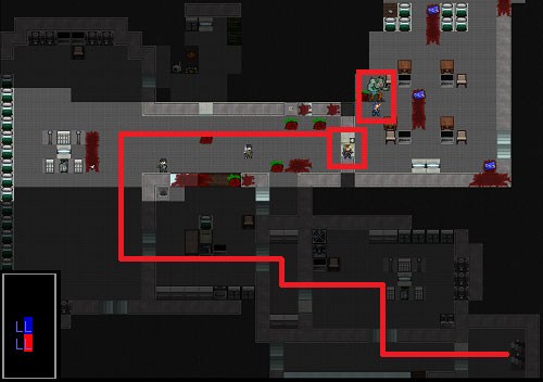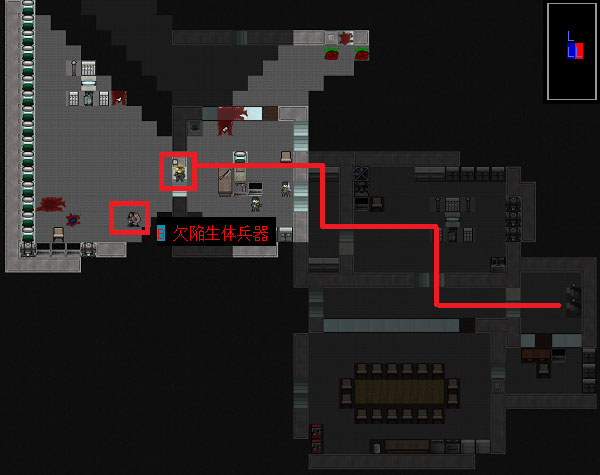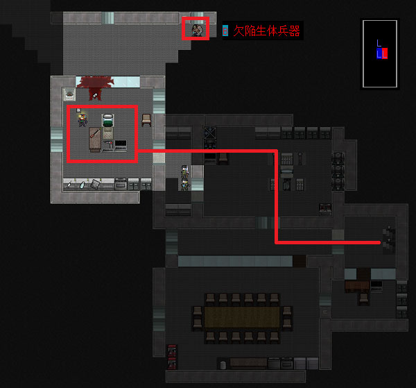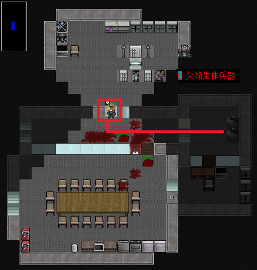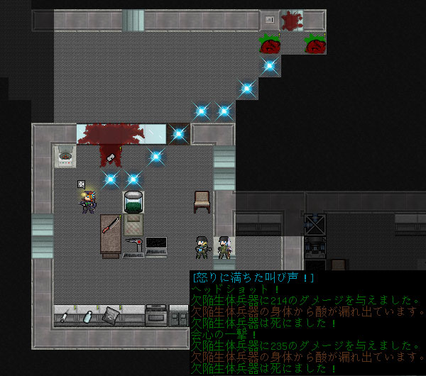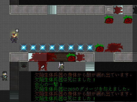 欠陥生体兵器と戦う際には距離をとったほうがよろしい。だがあまり研究所の中を走り回ると他の部屋にいる別の敵から挟み撃ちされるかもしれない。