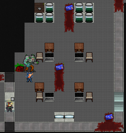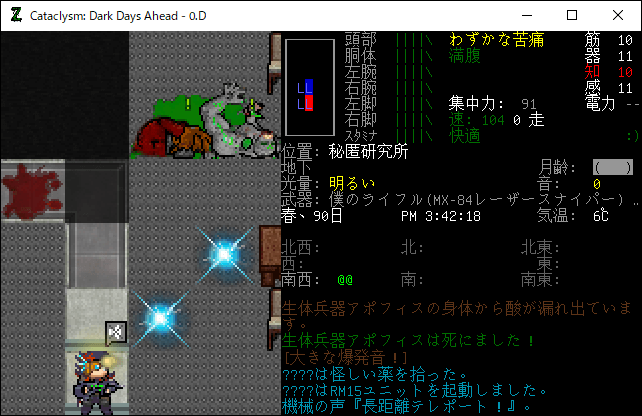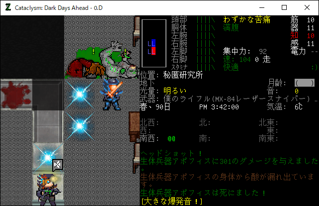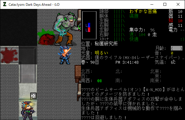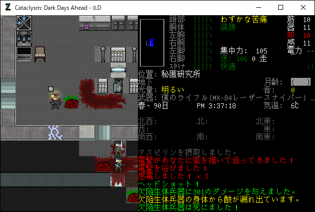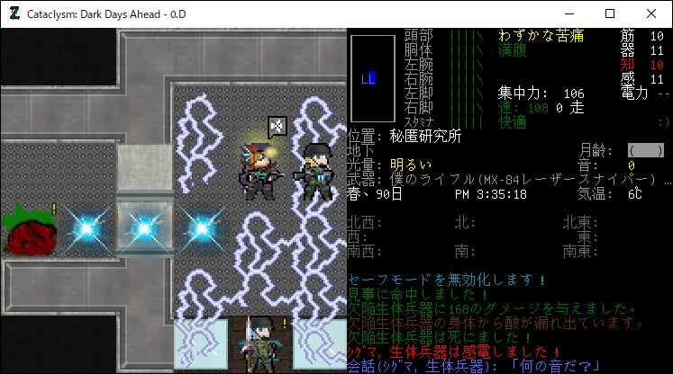 Cataclysmのプレイ日記を始めます。アポフィスの本拠地である秘匿研究所に来ました。研究所に降りたら欠陥生体兵器に襲撃されたよ。狭い部屋に放電されたから仲間と一緒にダメージをくらってしまった。