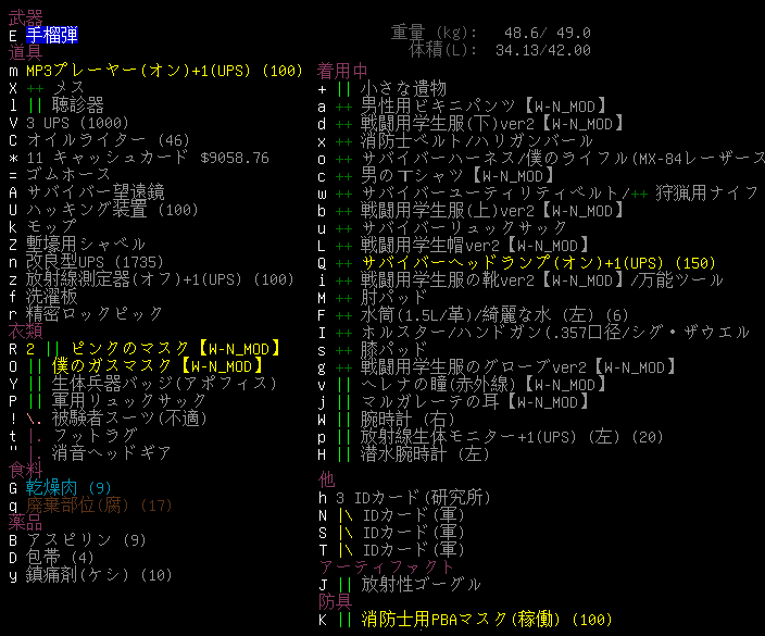 今回のプレイ日記はここで終了します。現在の所持品と装備品は上の画像。まだ秘匿研究所には未探索の部屋が沢山あります。鎮痛剤を摂取したら探索に向かうとしようか。