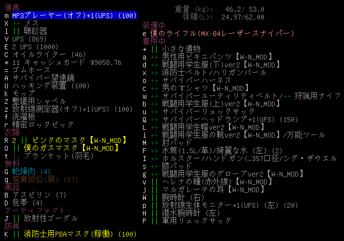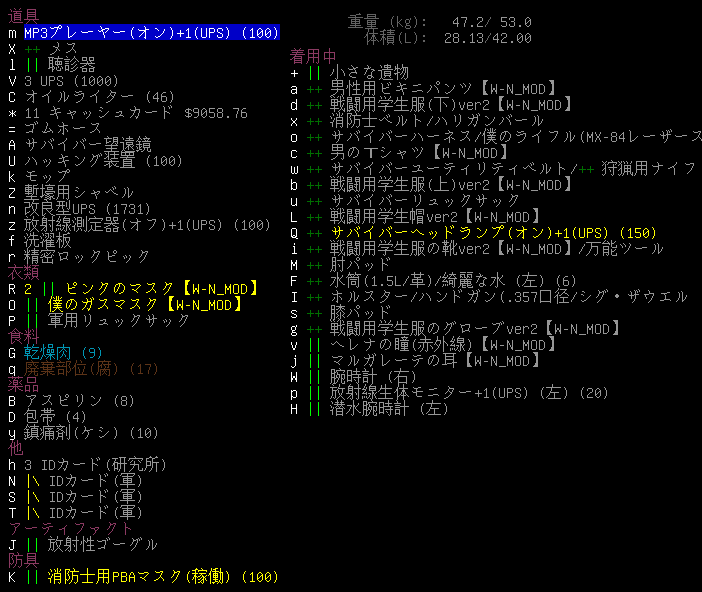 現在の所持品と装備品は上の画像。改良型UPSの残量が減るともったいないので手放しました。電力0のUPSを集めて電池容量拡張キットを取り付けようぜ。