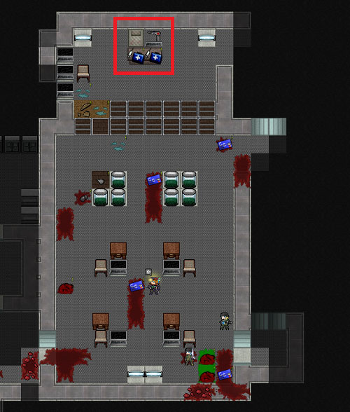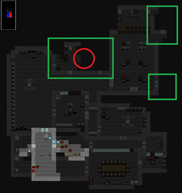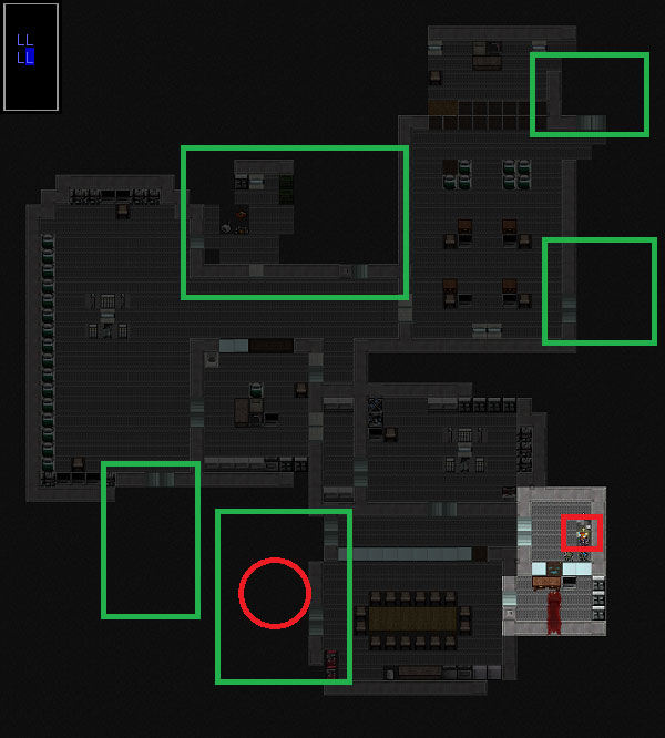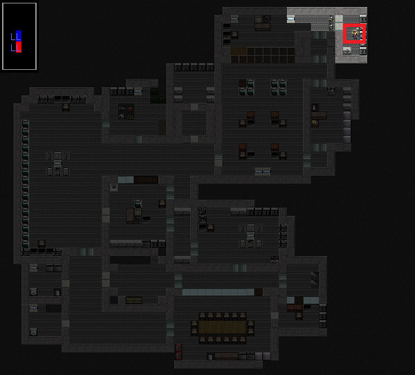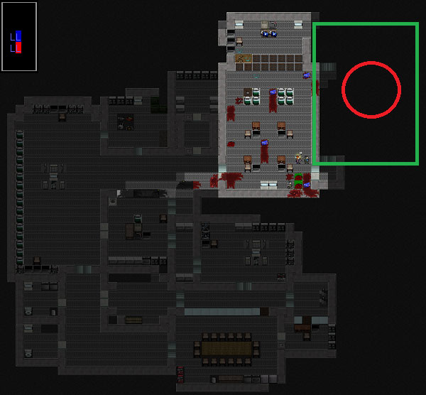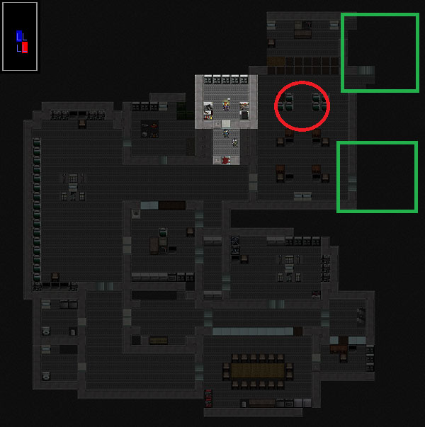ボロボロになりながらも秘匿研究所の南側を制圧しました。次は北側の部屋を調べに行きましょう。赤い丸で囲んだ部屋に移動します。