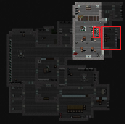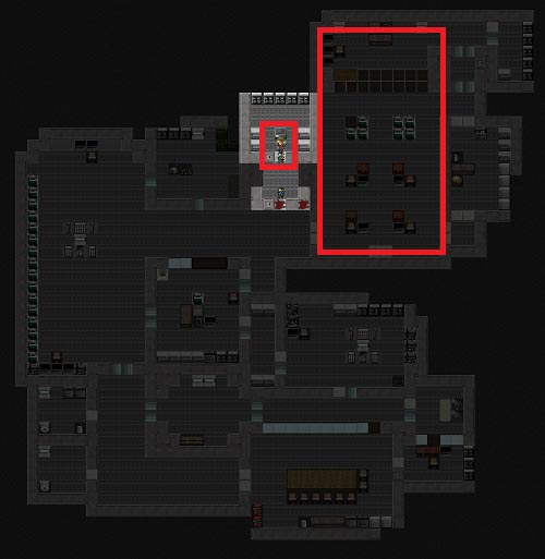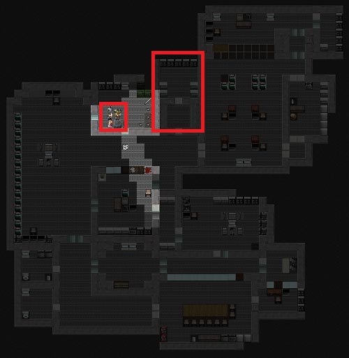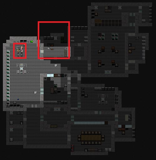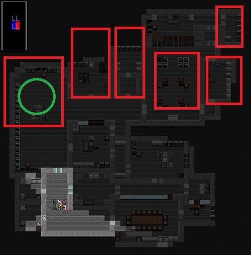 残る未探索の部屋は研究所の北側だけです。まずは左端から調べて右側に移動していきましょう。緑の丸で囲んだ左端の場所に行きますね。
