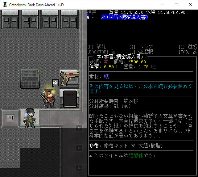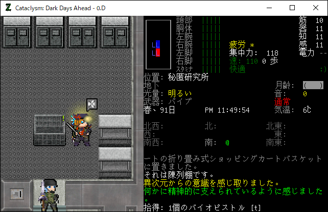 Cataclysmのプレイ日記を始めます。今回の投稿で秘匿研究所のアイテムを全て集めるつもりだった。画像の枚数が多くなったので投稿を前編・後編に分けました。今回と次回の2投稿で秘匿研究所の部屋を全て調べます。