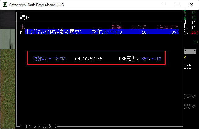 学習本を読んでいると時間が掛かります。ゆえに同時にCBMソーラーパネルで充電しようってわけなのだ。それでは製作スキルが9になるまで『学習/消防活動の歴史』を読みます。