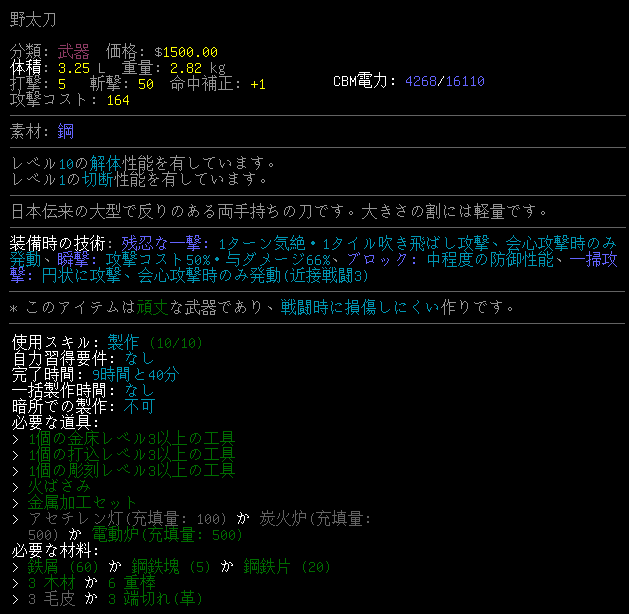 9時間ほど作業をして野太刀の製作が完了しました。CBMの電力量は『6943』になった(笑)。これだけ電力があれば、ありとあらゆるCBMを使い放題だな。