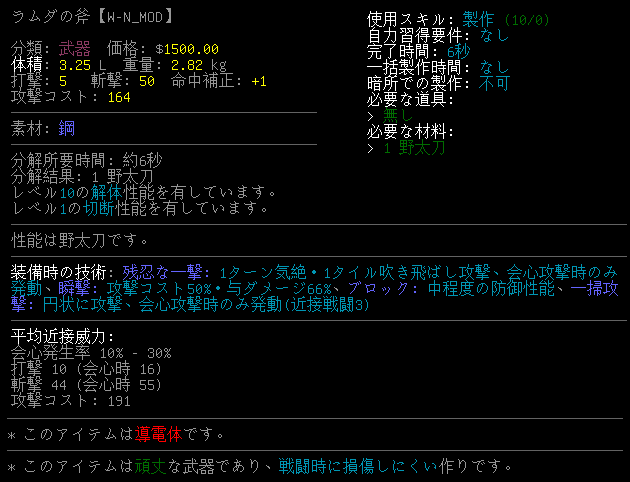 先ほど製作した野太刀にオリジナルのタイルを対応させます。竜鱗亭さんに描いてもらった斧のタイルを使わせてもらおう。名前を『ラムダの斧』に変えておきました。性能は野太刀と同じです。