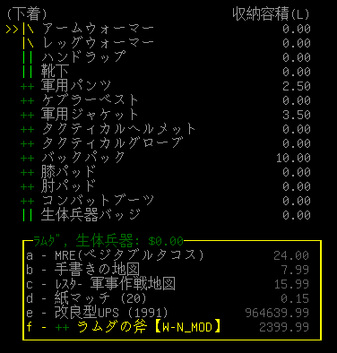 今回の投稿はここで終わりにします。現在の所持品と装備品は上の画像。タロウ・タナカの近接武器はラムダが装備していたスチールスピアにします。
