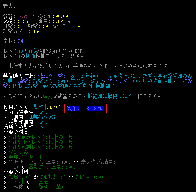 それでは今回の本題であるラムダの武器を作りましょう。ラムダには最強クラスの中世武器である『野太刀』を作ろうと考えている。しかし、野太刀を安定して作るには製作スキルが『10』も必要だ。タロウ・タナカの製作スキルは『8』なので何度も失敗するだろう。