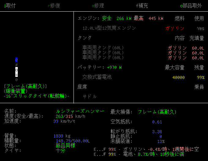 出発時のルシファーズハンマーは上の画像。やろうと思えば263km/hもの速度を出せるみたい。だけどCataclysmDDAって高速道路が無いからスピードを出すと危険なのよね。