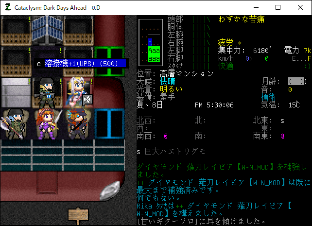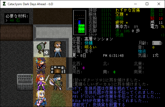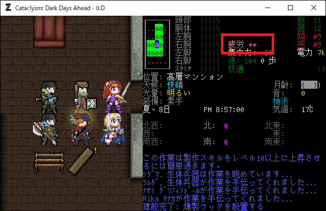 Cataclysmのプレイ日記を始めます。粘液穴の攻略を終えて高層マンションに帰還しました。今回は仲間の防具の修復、炭焼窯の建設、燻製ラックの設置を行います。
