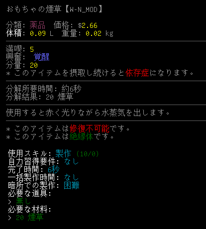 せっかくなので吟遊詩人から煙草を購入しておきました。この煙草を材料にして『おもちゃの煙草』の製作に取り掛かります。おもちゃの煙草は水蒸気を出す電子機器なので未成年でも安心して使えるのだ。