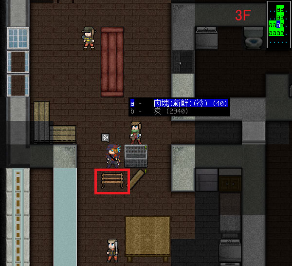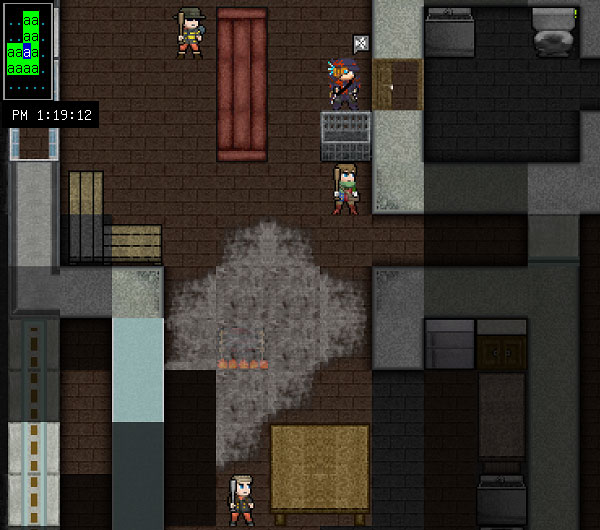 燻製ラックは大量の煙を発生させます。ものの数ターンで部屋の中央が煙まみれになってしまった。NPCたちが煙で苦しむから可哀想だ。まともな脳味噌の人間だったら屋内で燻製ラックを稼働させたりはしません。だが3階のフロアを煙まみれにするのは考えがあってのことなのです。