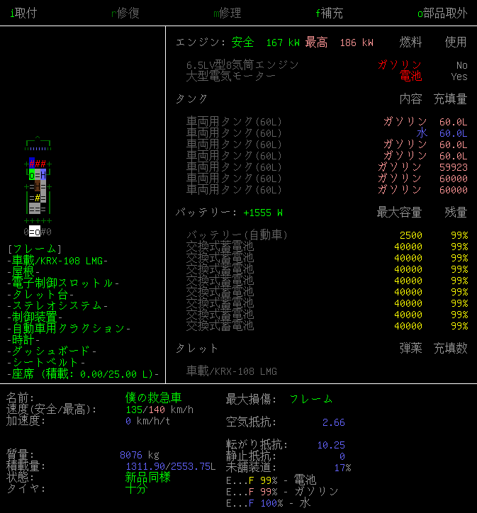 出発時の救急車は上の画像。特にコメントはありません。物資を運ぶための輸送車としては完成していると思われる。拠点車にするには改造が足りない。