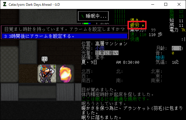 Cataclysmのプレイ日記を始めます。今回は色々とやることが多いので忙しい。睡眠を取ったのに疲労が溜まっているのは厳しいなあ。