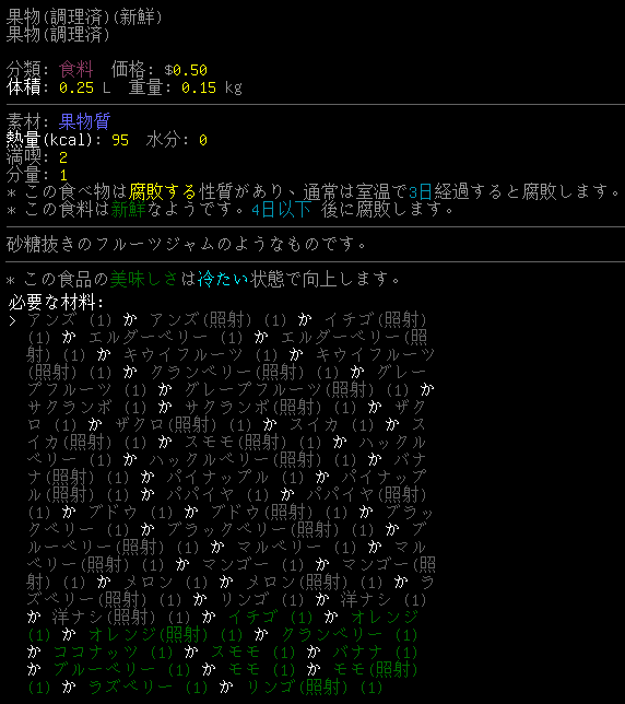 今回の投稿はここで終わりにします。現在の所持品と装備品は上の画像。よくばって果物を集めすぎてしまった。こんなに回収しても小型冷凍庫に入りきらないんだけどね。
