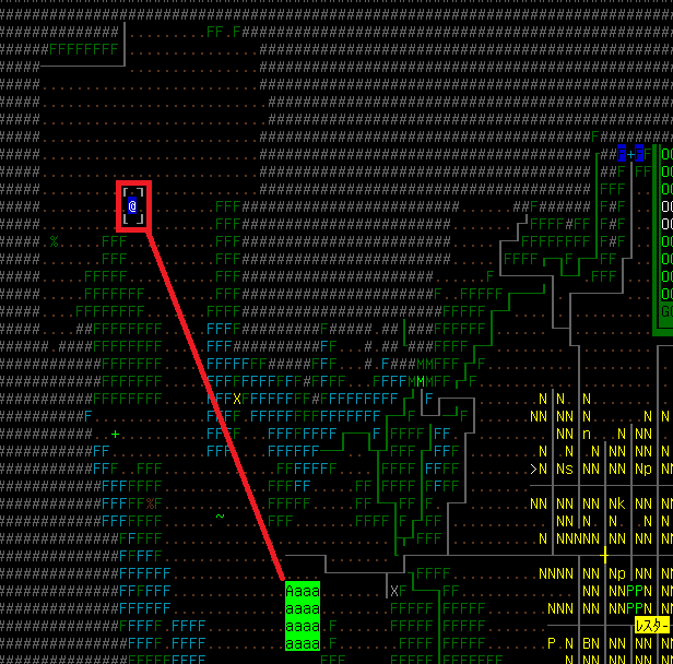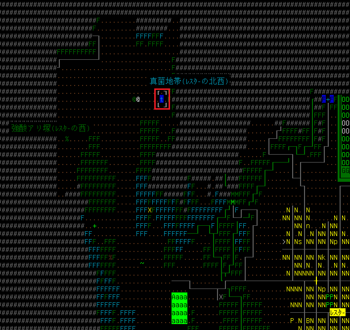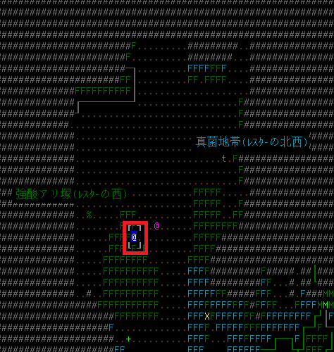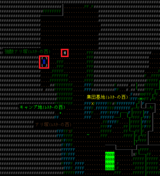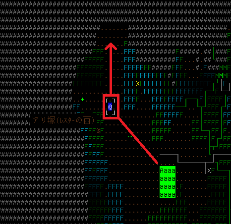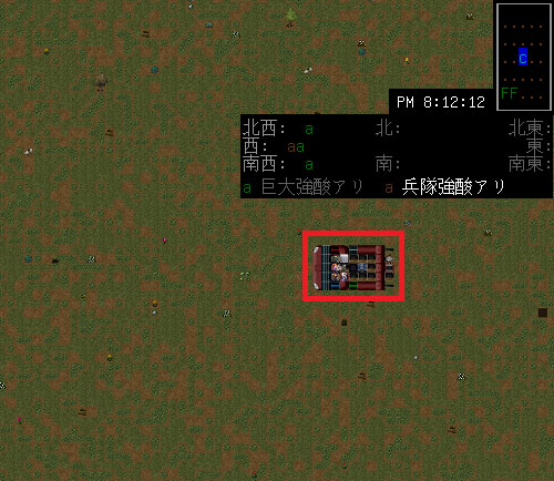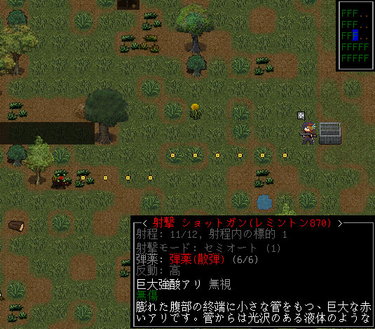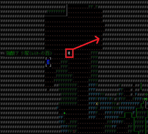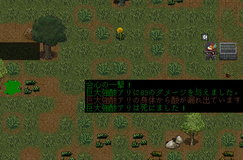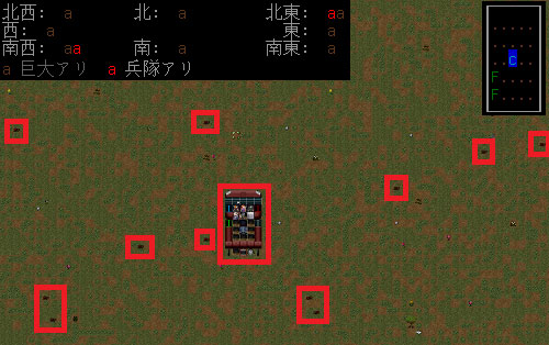 全体マップで強酸アリ塚を発見した時の俺は上の画像。まだ視界内に強酸アリ塚は見えません。だが何匹か巨大強酸アリが近づいて来ているみたいね。もうこの場所は強酸アリの縄張りだぞ。
