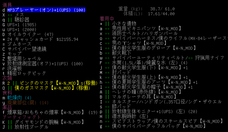 今回のプレイ日記はここで終了します。現在の所持品と装備品は上の画像。タロウ・タナカの学生服は耐火に優れた装備だ。残念ながら耐酸の性能は低い。