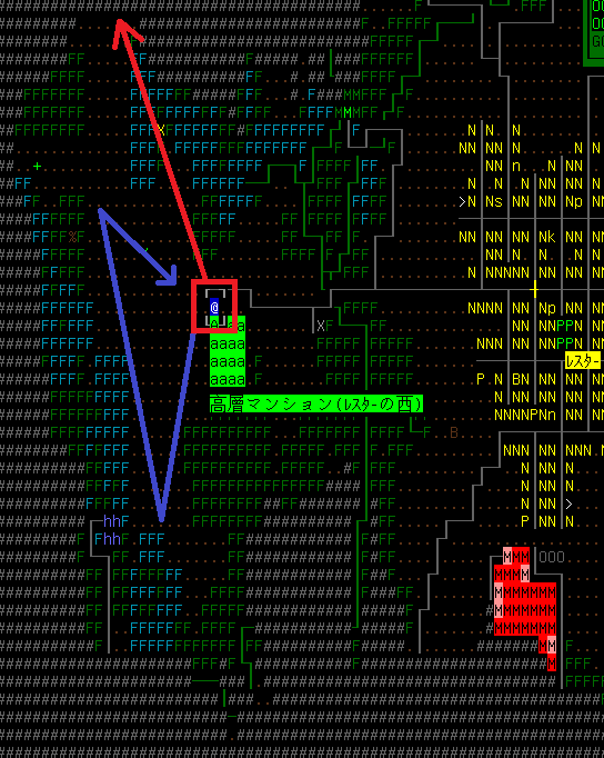 前回の投稿では高層マンションの南側を探索したのだった(青い矢印)。今回は北側を目指して出発します(赤い矢印)。小規模でも良いから町を発見できたら嬉しいな。