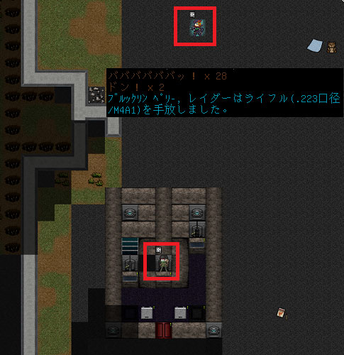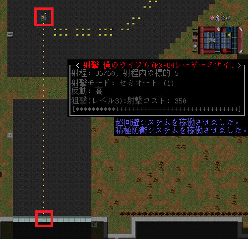 次は救急車を駐車していたスペースに徒歩で移動します。そして遠距離から金属シャッターを狙撃するのだ。レーザースナイパーの威力は150と桁違いなので金属シャッターを破壊できるんじゃないの。たしか@の溜まり場で壁の破壊に関する話題を読んだ気がする。