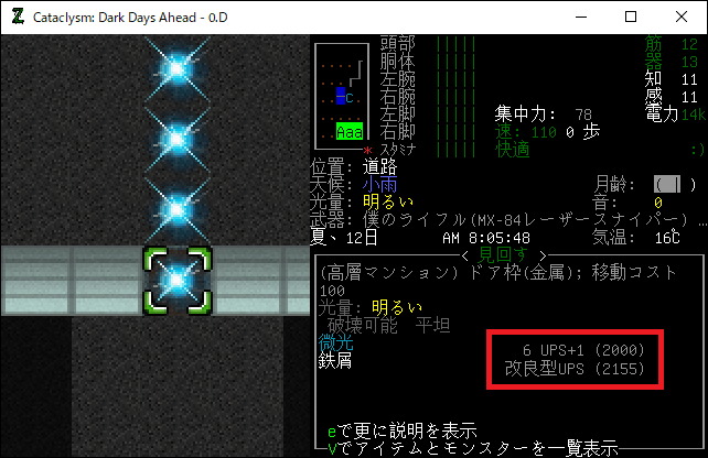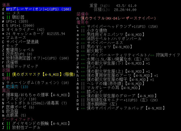 今回のプレイ日記はここで終わりにします。現在の所持品と装備品は上の画像。電力2155だった改良型UPSが残電力0になっている。普通のUPSも若干減っていますね。