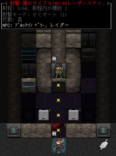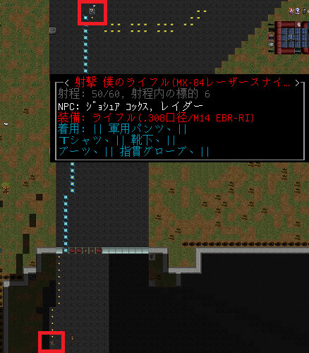 5枚ほどシャッターを破壊したところで敵対NPCが視界に入る。はるか遠くの場所にジョシュア・コックスがいるのを発見しました。ジョシュア・コックスとの距離は約50タイルみたい。