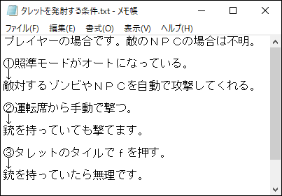 『オートの射撃(上の画像の①)』で殺される可能性は無くなった。次はブルックリンが『手動』で『ランチャー(120mm/自動装填戦車砲)』を撃ってくるのか考えます。タレット銃を手動で撃つ方法は2つある。1つは運転席に座ってダッシュボードを操作する方法だ(上の画像の②)。ブルックリンが座っている座席は運転席ではないから、この可能性も消えた。手動で撃つ2つ目のやり方はタレット台のタイルでfを押す方法です(上の画像の③)。しかし、銃器を装備している状態でfを押してもタレット銃は撃てません。装備している銃器での射撃が優先されるからだ。ブルックリンは『ライフル(.223口径)』を装備している。つまりブルックリンが手動によりタレット銃のランチャーを発射することは有り得ない!