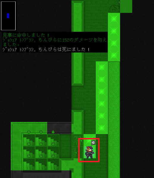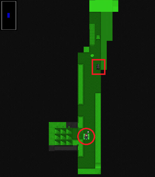 CBMを使って無理やり突撃するのも悪くはないが落ち着こう。全体マップで敵の位置を確認します。現在地のマスに盗賊はいません。現在地から東に進むと4体のちんぴらがいるようだ(上の画像)。