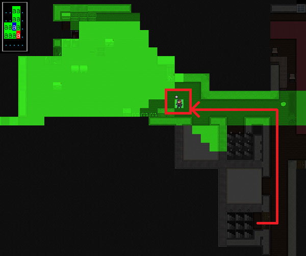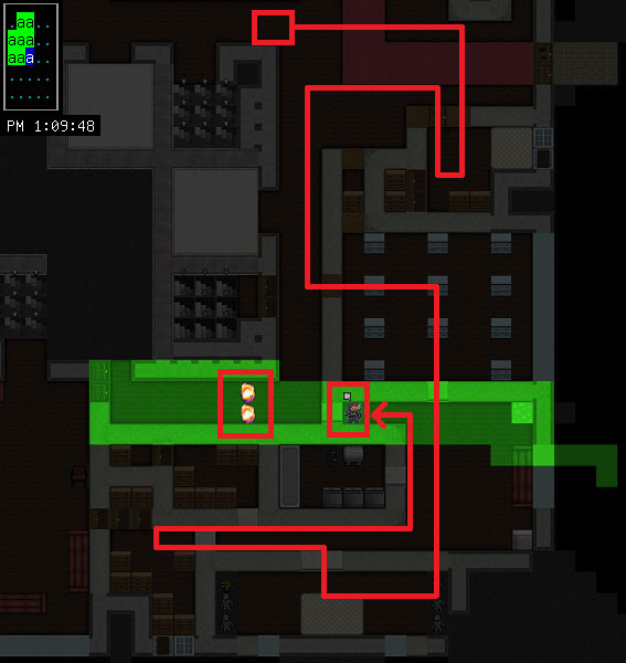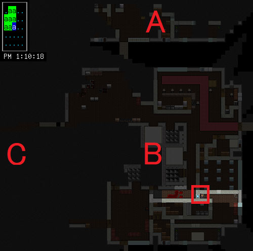 現在の全体マップは上の画像。現在地から南に進むと2体のちんぴらがいます。B棟4階に残っている敵対NPCはこの2人だけだ。もうレーザーで壁を破壊するのは嫌だから(泣)、CBMに頼ろうかなあ。