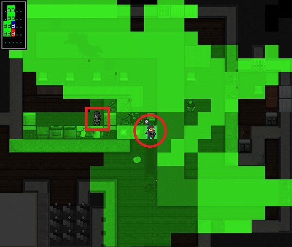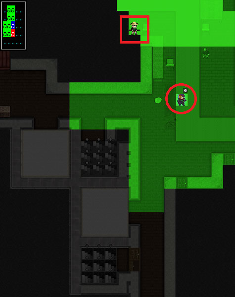 スッと斜めに後退して『非常に暗い』タイルに移動しました。この場所なら敵から俺の姿は見えません。プレイヤーが視覚外に逃げたら敵のNPCは追って来ないので安心だ。今回はこれで助かったけど、敵の武器が大口径ライフルだったら死んでいたかもしれないので反省しようぜ。