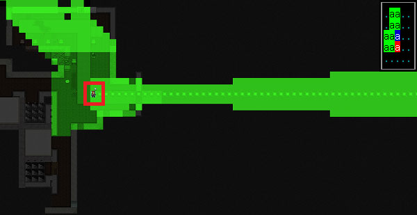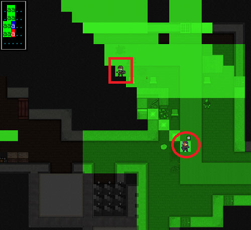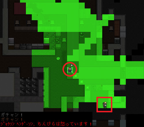 敵の武器は有刺鉄線バットだから発見されたところで怖くはない。だが、なぜ発見されたのか原因を調べておくべきだ。俺のいる場所の光量が『薄暗い』になっています(敵の場所の光量は『明るい』)。壁を壊しまくったので廊下が明るくなったんだなあ。