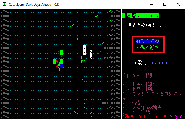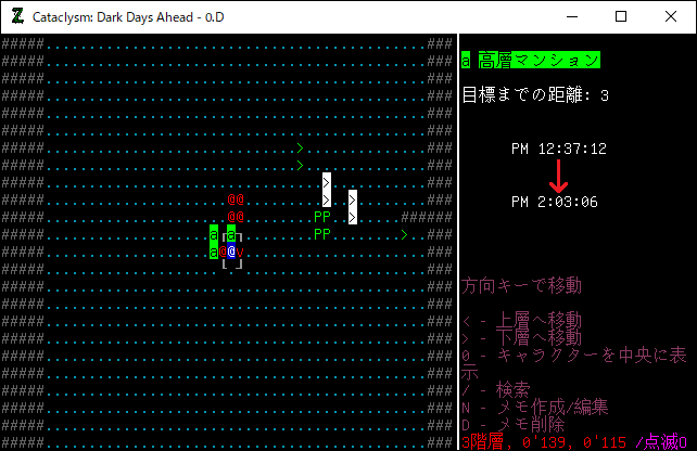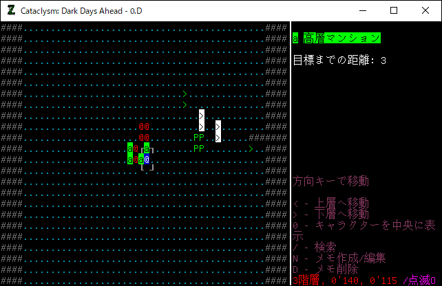Cataclysmのプレイ日記を始めます。高層マンションのB棟3階を制圧しました。敵対NPCとの戦闘に慣れてきたし順調だ。今回はB棟4階を攻略します。