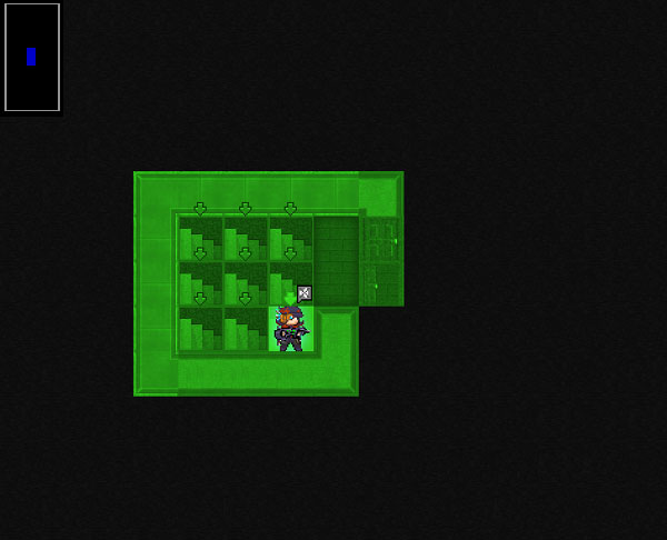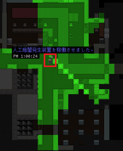 『CBM:人工暗闇発生装置』を稼働させました。キラキラと緑色に輝いていた部屋が真っ暗になっています。人工暗闇発生装置は数あるCBMのうち最強の対人間用CBMだろう。何をしたって敵から姿が見えなくなる。難点は何度か書いたけどCBM電力の消費が激しいことだね。