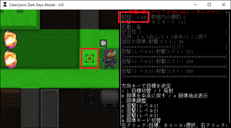 今なら人工暗闇発生装置の効果により余裕で勝てます。レーザーを発射する前にちょっと解説したいことがあるので聞いてください。『f』コマンドを押すと上の画像のように照準の赤い丸が出現します。この状態で左を4回押すと敵に照準が合うわけだ。