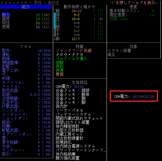 現在の能力値は上の画像。なんとかCBM電力を全快することができました。盗賊の遺品を体内炉に入れるだけでは足りなかったので大変だった。