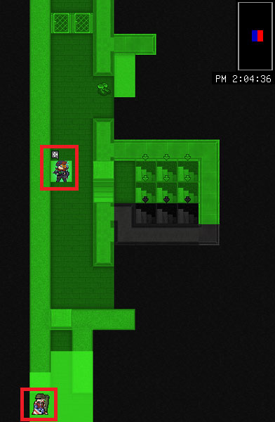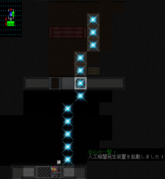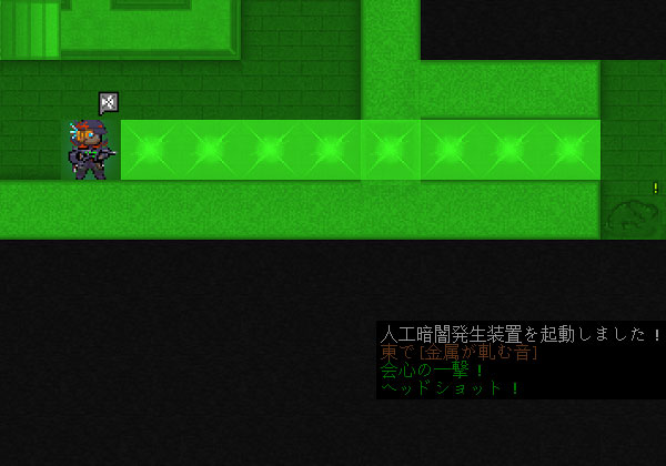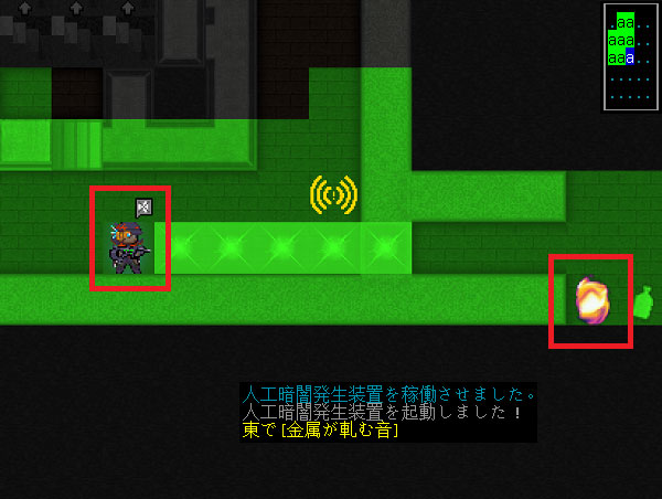 『X』コマンドをキャンセルして4階に戻りました。5階の敵が怖くなったので万全の態勢をとりたい。まずは『CBM:人工暗闇発生装置』を稼働させましょう。これで敵対NPCに不意打ちをくらうことは無くなった。