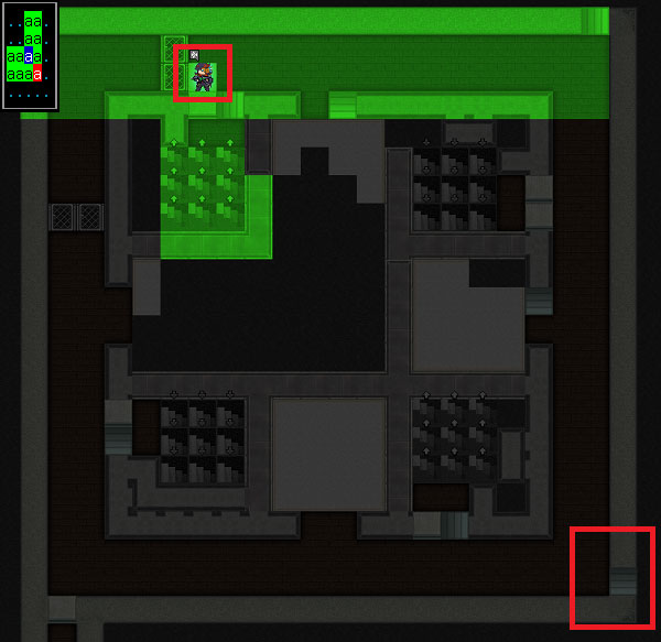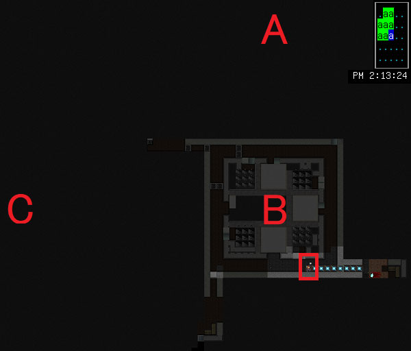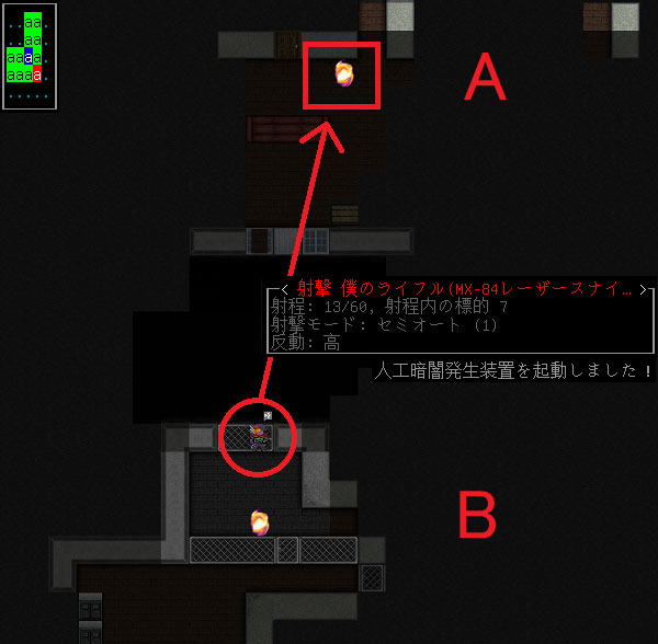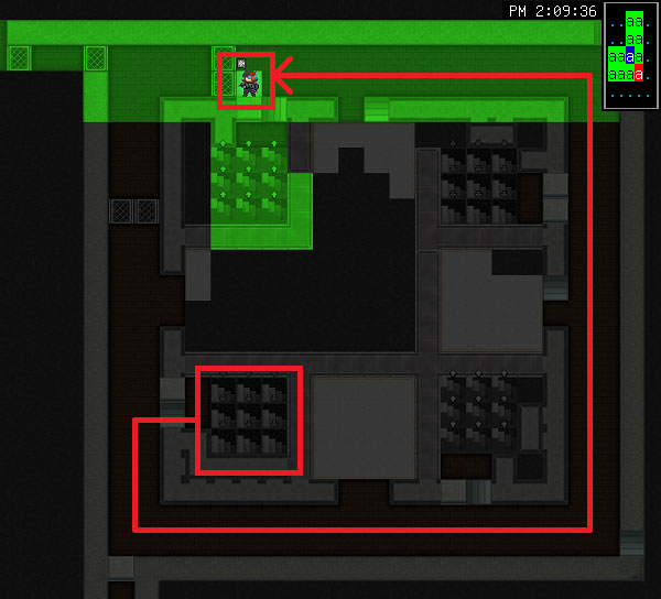 B棟の最北端からレーザーを発射して盗賊の撃破に成功しました。暗闇の中でキラキラと光って花火みたいに綺麗だなあ。全体マップを確認したところ、もうA棟の南に盗賊はいないようです。これで何の危険もなく部屋の中を歩けるようになった。