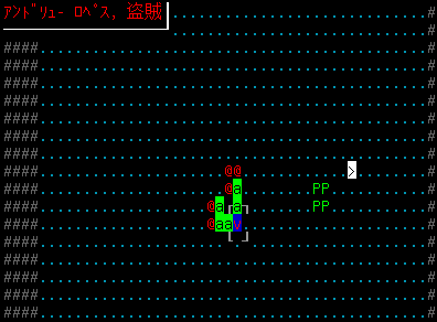 廊下は暗くて安全だけど曲がり角でNPCと遭遇することもある。『X』コマンドで覗きながら慎重に階段の周囲を歩いていきます。恐る恐る進んでいたら敵と遭遇することなく階段を一周してしまった。なんだよ盗賊は1人しか減らせなかったあ。