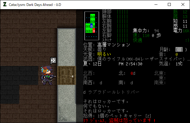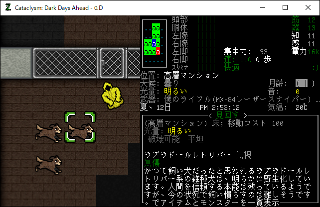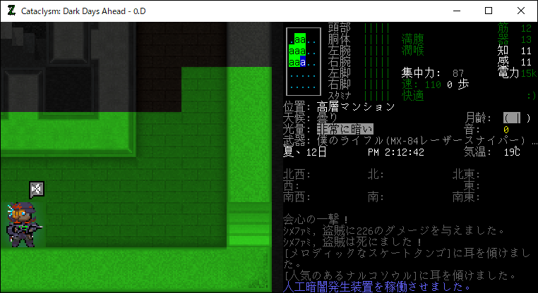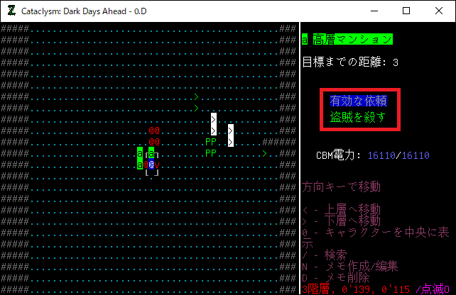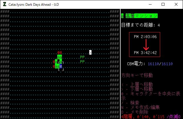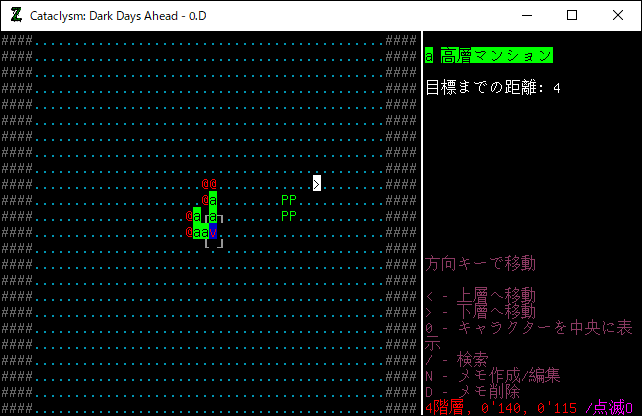 Cataclysmのプレイ日記を始めます。高層マンションB棟4階を制圧しました。今回のプレイ日記は5階を攻略します。俺は下手なのでたまに死にそうになるから困る。