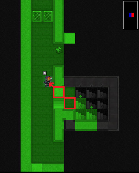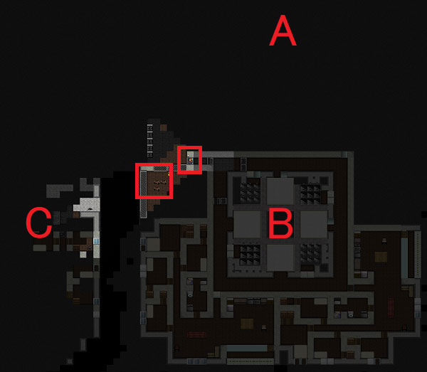 現在の俺は赤い丸の位置、B棟5階の最北端にいる。敵の盗賊は赤い四角の位置、A棟の最南端になります。油断してA棟にいる盗賊の視界内に入ってしまった。